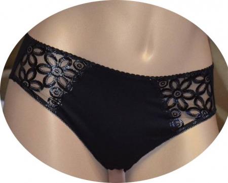 Figi klasyczne z wyrazistym haftem w kolorze głębokiej czerni z delikatnym połyskiem powoduje niesamowity efekt wizualny. Figi wykonane z haftu w połączeniu z delikatna i przyjazną ciału mikrofibrą. Do kompletu biustonosz K30 Adele Soft.