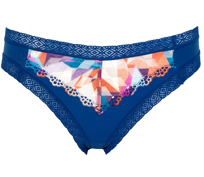 Figi klasyczne z kolekcji Rinko wyróżniające się geometrycznym, kolorowym wzorem od firmy Dalia. Figi wykonane z gładkiej, szafirowej dzianiny. Krój fig zasłaniający pośladki, przód w okolicach pasa ozdobiony kolorowym haftem. Figi na całości wykończone delikatną, ozdobną gumeczką. W kroku wszyta bawełniana wkładka dla większego komfortu użytkowania. Model w kolorze szafirowym-jak na zdjęciu. Do kompletu biustonosz Rinko K24 i Rinko K02.