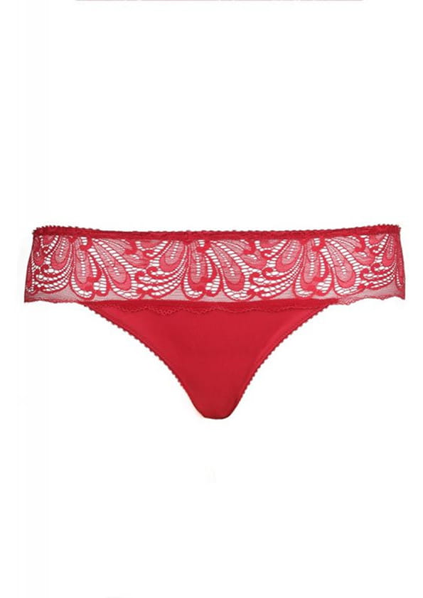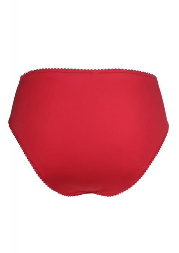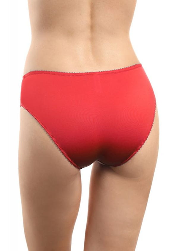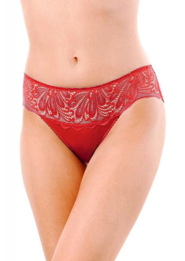 Czerwone figi o klasycznym kroju z kolekcji Angel od firmy Jolidon. Model idealny dla kobiet ceniących komfort, wygodę oraz lubiących klasykę. Figi na całości wykonane z miękkiej, sprężystej, gładkiej dzianiny. Przód w górnej części ozdobiony pasem koronki. Pas oraz nogawki wykończone delikatną gumeczką. Tył pełny, zakrywający pośladki. W kroku od wewnątrz wszyta bawełniana wkładka dla większego komfortu użytkowania. Model jak na zdjęciu w odcieniu czerwonym.