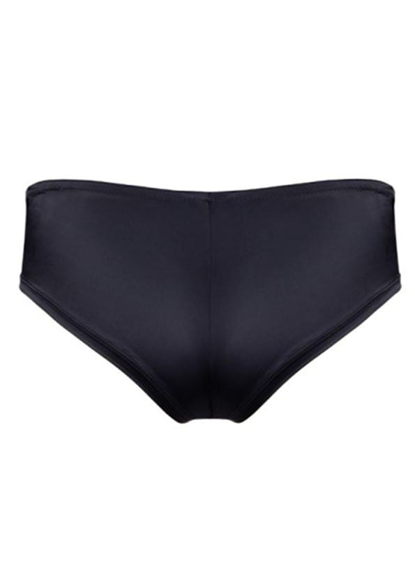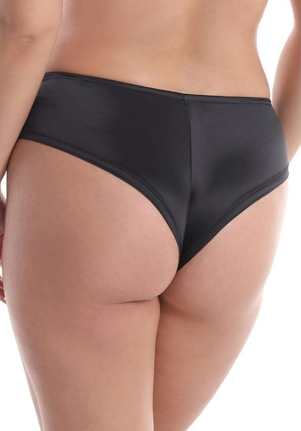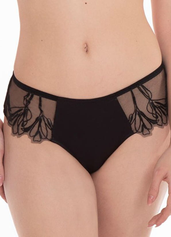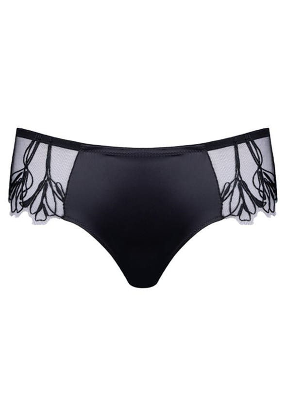Figi o kroju brazil z kolekcji Love Supreme od firmy Jolidon. Krój fig zasłania i jednocześnie odkrywa połowę pośladków. Seksownie podkreśla kobiece kształty. Wysokość poniżej pępka. Figi wykonane z połyskującej, elastycznej satyny, która dzięki swojej sprężystości dostosowuje się do ciała. Po bokach tiulowe, szerokie wstawki z haftem. Pas oraz przód nogawek wykończony gumeczką. Tył gładki, z pionowym szyciem przez środek. Na pośladkach wykończone delikatnym obszyciem, które nie wpija się w ciało. W kroku wszyta bawełniana wkładka dla większego komfortu użytkowania. Model jak na zdjęciu w kolorze czarnym.