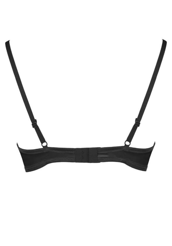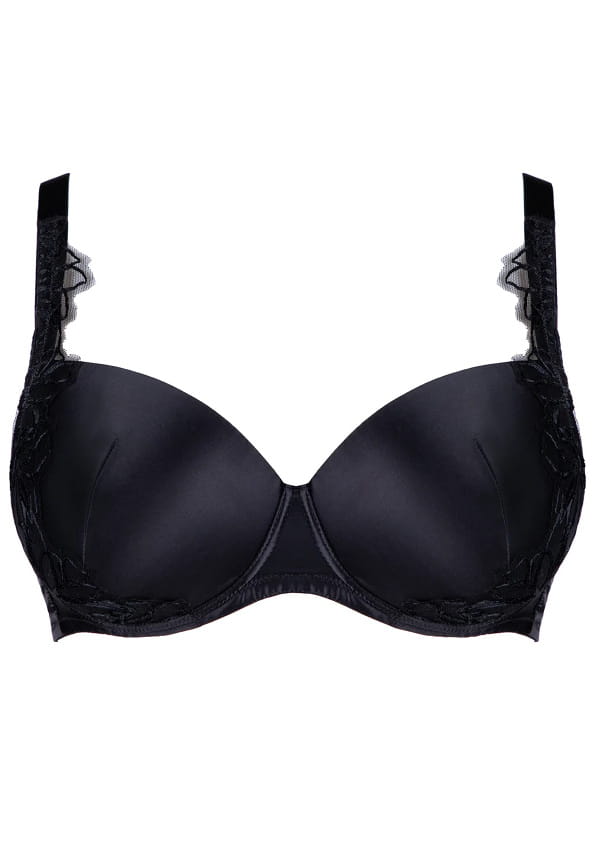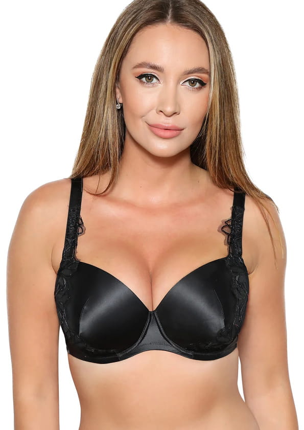 Seksowny, usztywniany biustonosz z fiszbinami z kolekcji Love Supreme od firmy Jolidon. Model z głęboką, pełną miseczką, bez push-up. Zbiera i unosi biust do góry naturalnie go układając. Miseczki z fiszbinami, usztywnione profilowaną pianką, pokryte połyskującym, satynowym materiałem. Po zewnętrznych stronach pokryte tiulem z haftem, wyciągniętym ku górze do ramiączek. Ramiączka szersze, nie odpinane, regulowane. Obwód wykonany z materiału jak na miseczkach, wzmocniony od środka siateczką. Tył zapinany na dwurzędowe haftki z trójstopniową regulacją obwodu. Model jak na zdjęciu w kolorze czarnym.