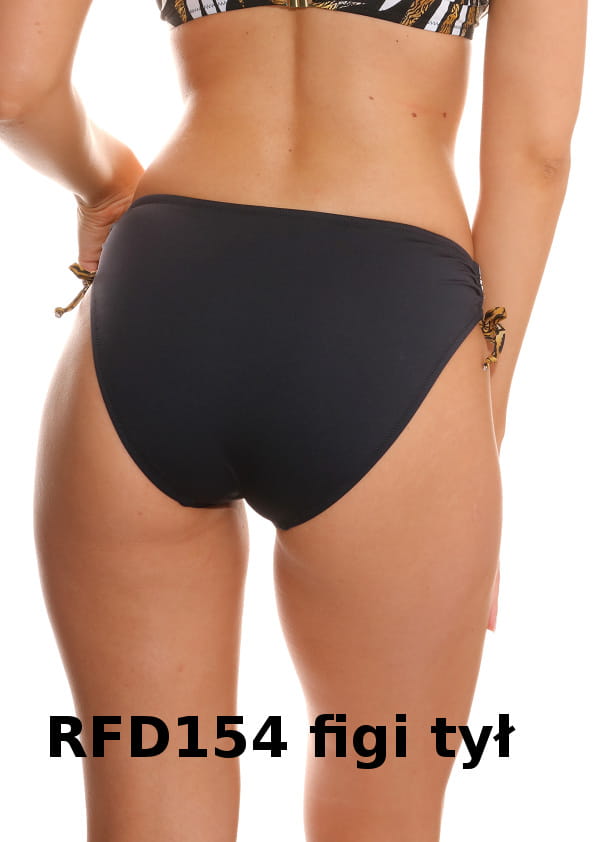 Elegancki kostium kąpielowy w kremowo-złotym wzorze od firmy Jolidon. Model zbiera biust do środka, powiększa go nadając okrągły kształt. Dedykowany Paniom z mniejszym biustem. Biustonosz z usztywnianymi miseczkami oraz fiszbinami. Od wewnątrz wszyte żelowe wkładki push-up bez możliwości wyjęcia. Miseczki ozdobione materiałem skrzyżowanym przez środek. Ramiączka regulowane, odpinane z tyłu dzięki czemu można zawiązać je na szyi. Boki oraz tył wykonane z pojedynczej warstwy materiału, tył zapinany na metalowe zapięcie. Biustonosz z kolorze czarnym, ze wzorem złoto-kremowych łezek przypominających liście. Figi RF152 (na modelce) to klasyczne figi zasłaniające w znacznej części pośladki, wysokość poniżej pępka. Od wewnątrz wzmocnione na całości dodatkową warstwą materiału. Figi na całości we wzorze jak biustonosz. Dostępne przy rozmiarze 70C. Figi RFD154 (patrz galeria zdjęć) to figi o klasycznym kroju, zasłaniające pośladki, z wyższym stanem, ściągane po bokach sznureczkami. Od wewnątrz wzmocnione na całości dodatkową warstwą materiału. Figi w kolorze czarnym, przednia część ozdobiona pasem ze wzorem jak biustonosz. Dostępne przy rozmiarze 80C. Model jak na zdjęciu.