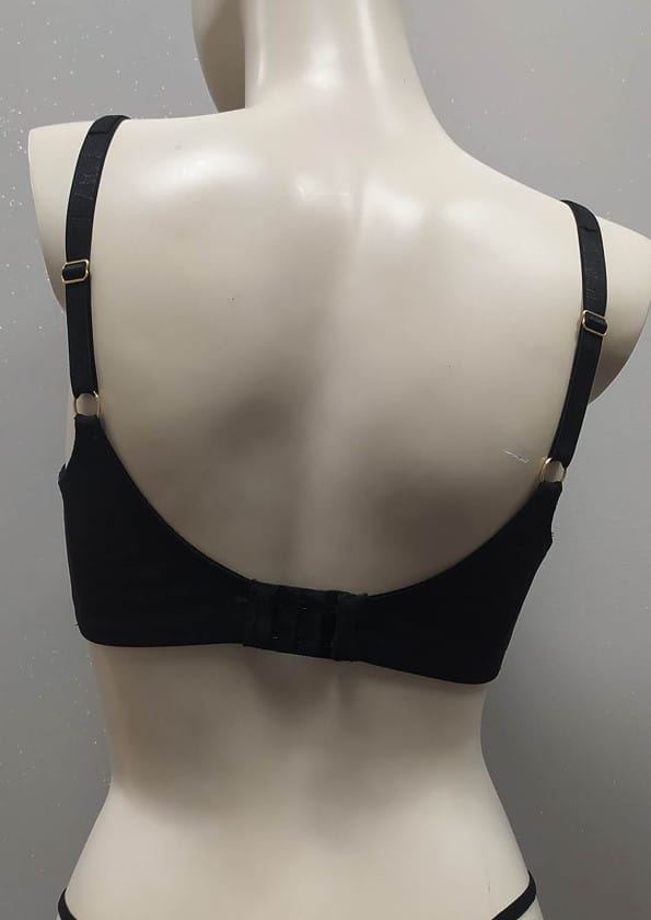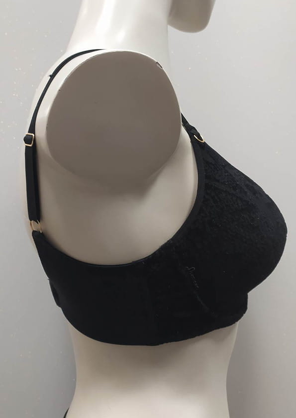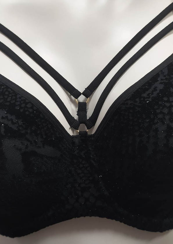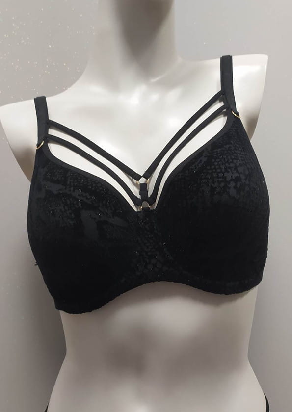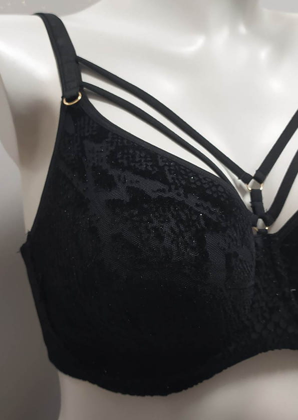 Mega wygodny, nie odznaczający się pod ubraniem biustonosz z fiszbiną typu spacer od firmy Lemax. Model z termicznie formowanymi miseczkami. Dzięki zastosowanej technologii, pod wpływem ciepłoty ciała miseczki układają się do kształtu biustu. Model zbiera biust, nadając mu naturalny kształt. Miseczki wykonane z miękkiej, cienkiej, czarnej pianki. Z zewnątrz pokryte tiulem z welurowym, wężowym wzorem. Wzór przeplatany srebrną nitką. Od wewnątrz wszyty siateczkowy panel boczny dzięki czemu biust zebrany jest do środka. Model z wyższym mostkiem. Między miseczkami do ramiączek rozchodzą się nieregulowane, sprężyste paseczki ze złotymi kółeczkami, które tworzą piękną ozdobę na biuście. Ramiączka nie odpinane, regulowane z tyłu do 2/3 wysokości. Boki biustonosza wzmocnione panelem bocznym, co zapewnia większą stabilność. Obwód wykonany z podwójnej warstwy czarnego tiulu. Zapinany na dwu lub trzyrzędowe haftki z trójstopniową regulacją obwodu. Model jak na zdjęciu w kolorze czarnym.
