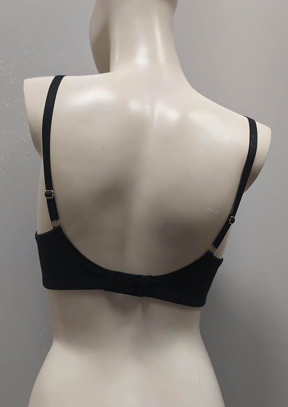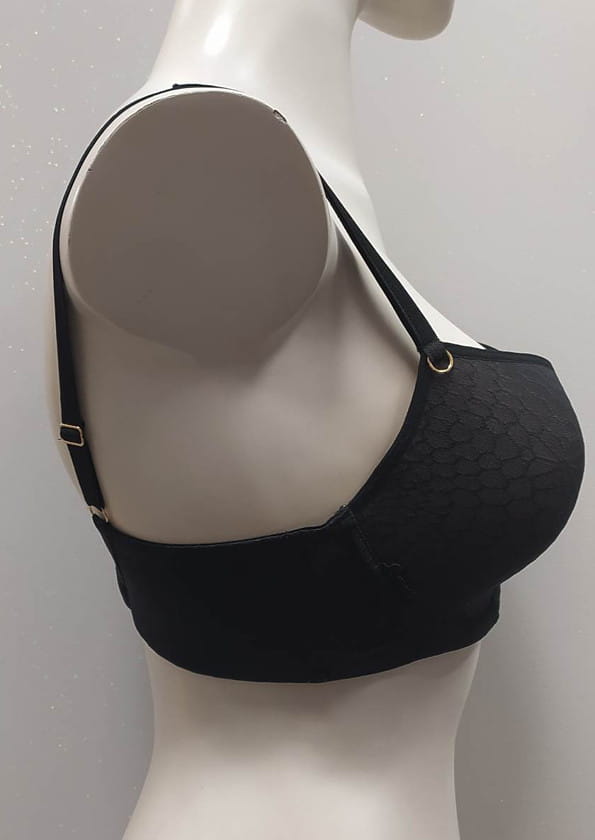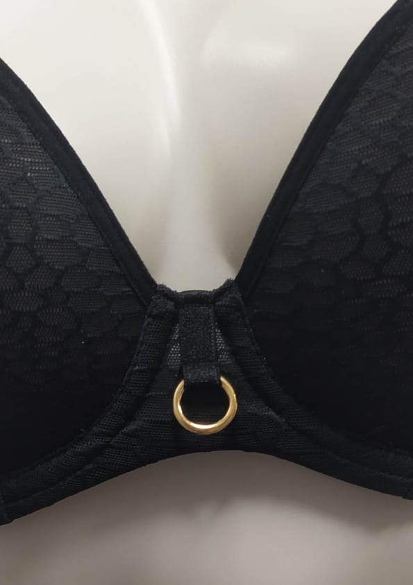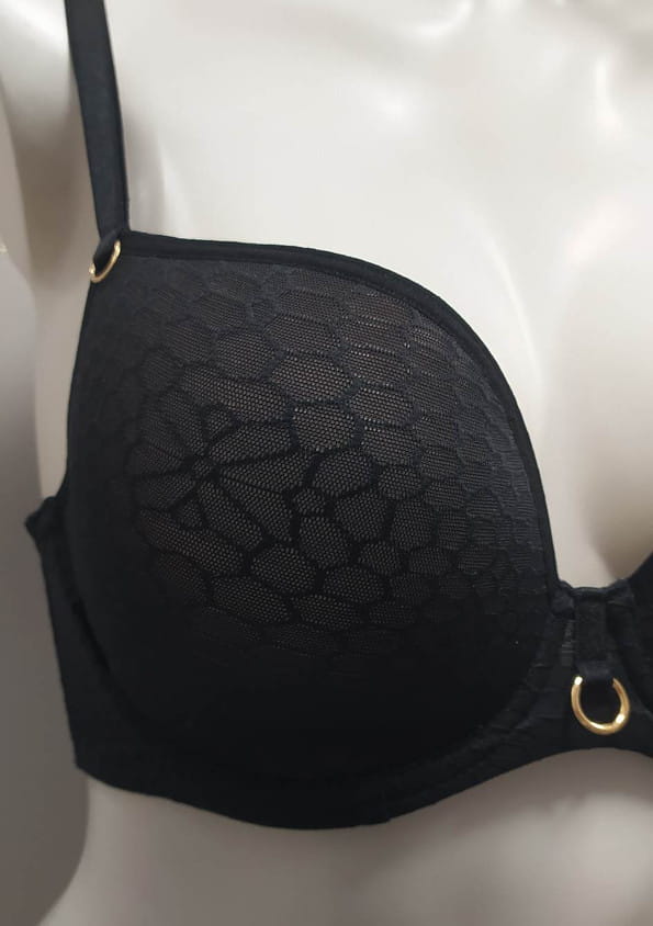 Miseczki z fiszbinami, usztywnione profilowaną, grubszą, beżową pianką, nisko ze sobą połączone. Z zewnątrz pokryte czarnym tiulem z tłoczonym na płasko wzorem przypominającym plastry miodu. Wzór nie wybija się pod gładkim ubraniem. Miseczki od środka posiadają siateczkowe panele boczne zbierające biust. Model bez dodatkowych wkładek push-up. Ramiączka nie odpinane, regulowane z tyłu do 2/3 wysokości. Boki oraz tył wykonane z podwójnej warstwy czarnej siateczki, we wzorze jak na miseczkach. Tył zapinany na dwurzędowe haftki, z trójstopniową regulacją obwodu. Wszystkie dodatki typu kółeczka na ramiączkach i między miseczkami oraz regulacja ramiączek, jak zapewnia producent, mają domieszkę złota, dzięki temu nie odbarwiają się i zachowują swój kolor.