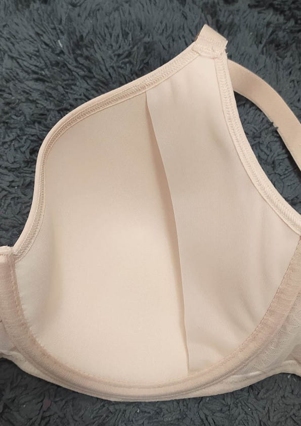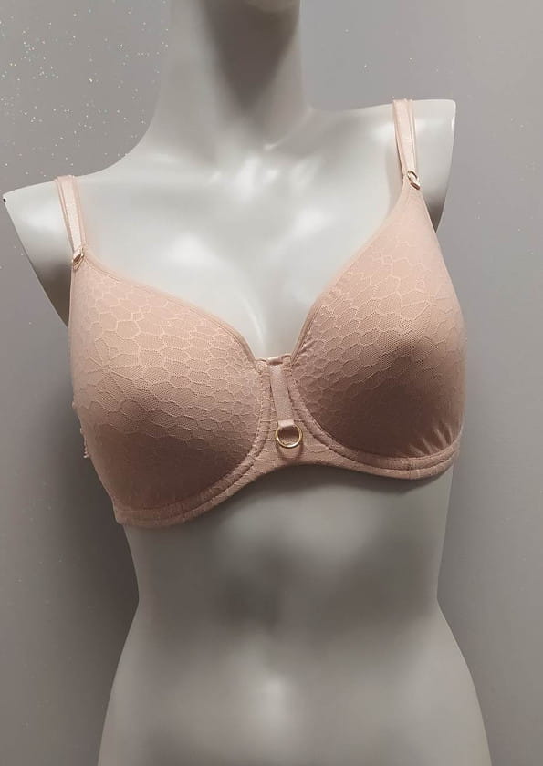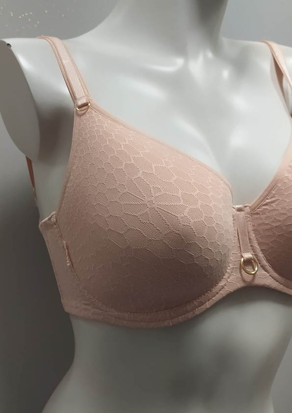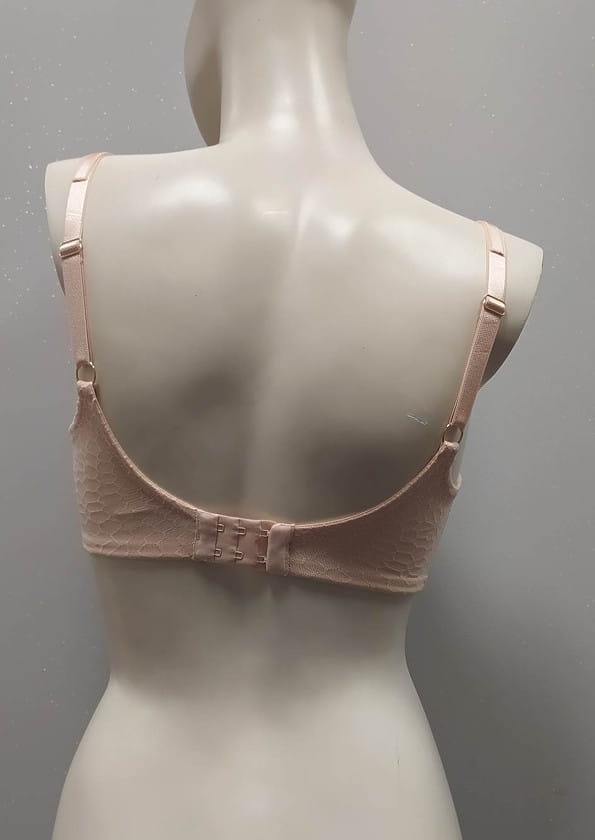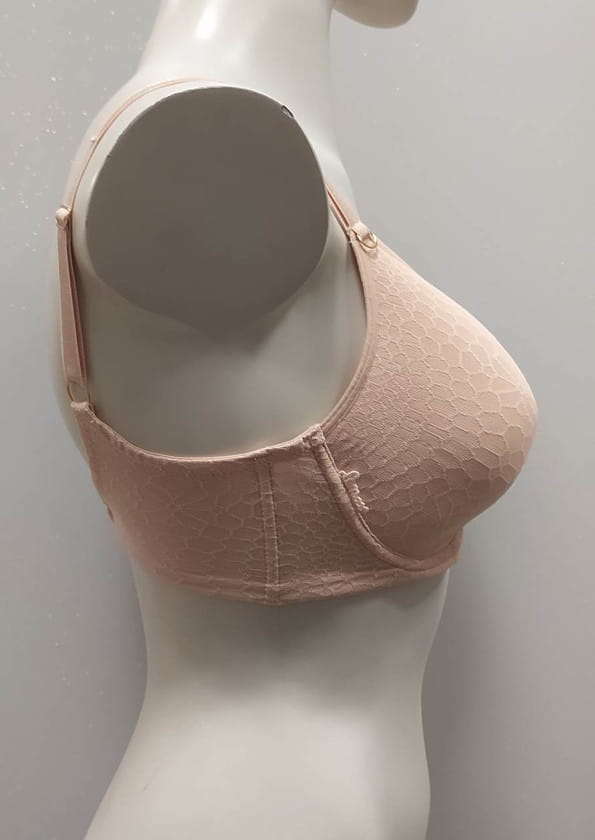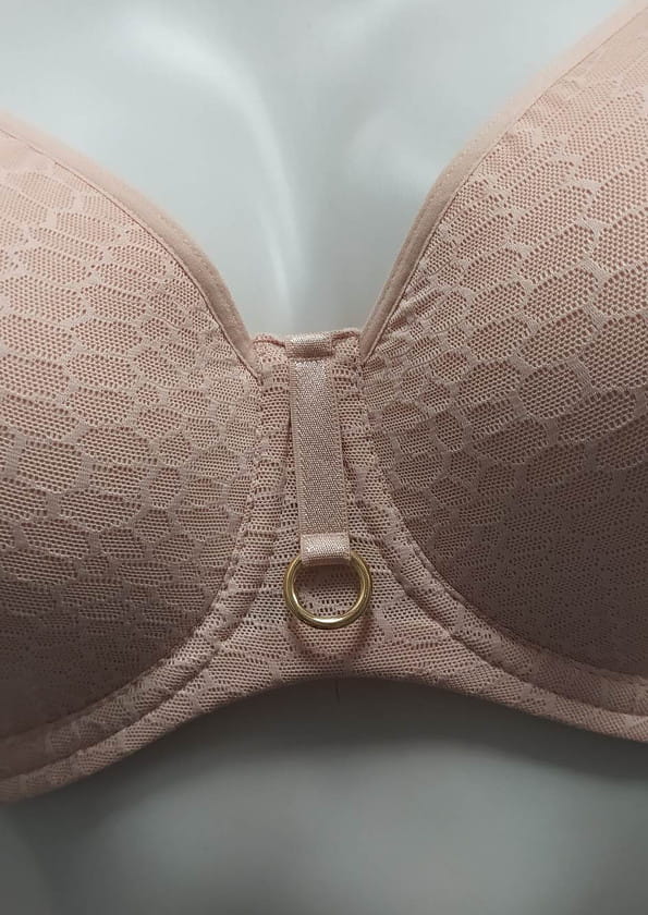 Mega wygodny, nie odznaczający się pod ubraniem biustonosz z fiszbiną typu spacer od firmy Lemax. Model z termicznie formowanymi miseczkami. Zbiera biust nadając mu naturalny kształt. Dzięki zastosowanej technologi, pod wpływem ciepłoty ciała miseczki układają się do kształtu biustu. Miseczki wykonane z miękkiej pianki ozdobionej tiulem z tłoczonym płaski wzorem imitującym plaster miodu. Od wewnątrz wszyty siateczkowy panel boczny dzięki czemu biust zebrany jest do środka. Między miseczkami ozdobny pasek z kółeczkiem. Boki biustonosza wzmocnione panelem bocznym, co zapewnia większą stabilność. Obwód wykonany z tiulu którym pokryty jest z zewnątrz materiałem jak na miseczkach. Ramiączka nie odpinane, regulowane z tyłu. Zapięcie na dwurzędowe haftki z trójstopniową regulacją obwodu. Model jak na zdjęciu w odcieniu beżowym- nie widoczny pod jasnym ubraniem.