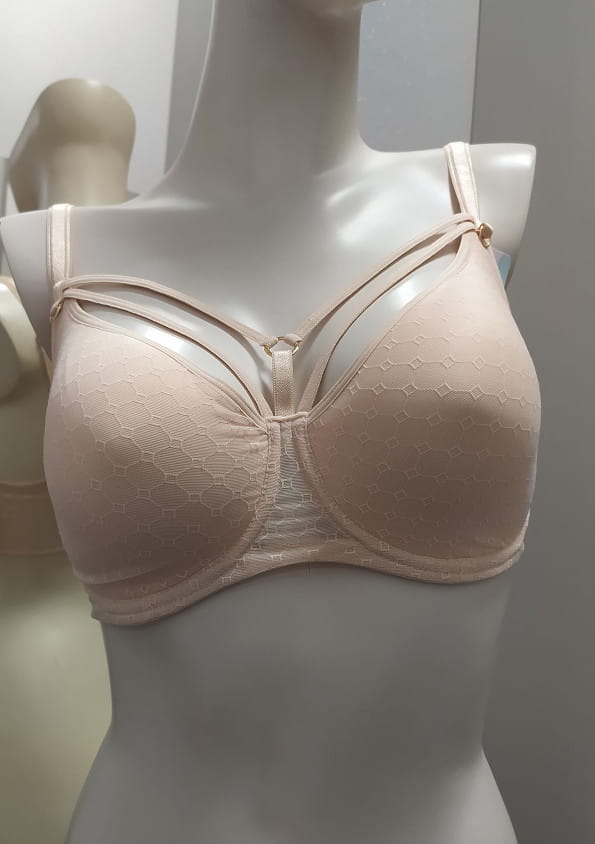 Mega wygodny biustonosz z fiszbiną typu spacer, z ozdobnymi paseczkami na dekolcie od firmy Lemax. Model z termicznie formowanymi miseczkami, które pod wpływem ciepłoty ciała układają się do kształtu biustu. Miseczki pokryte drobną siateczką z płaskim wzorem plastra miodu. Od wewnątrz wszyty siateczkowy panel boczny który zbiera biust do środka. Dekolt ozdobiony elastycznymi, nie odpinanymi paseczkami. Boki oraz tył biustonosza wykonane z tej samej siateczki co miseczki, wzmocnione od wewnątrz elastyczną warstwą tiulu. Ramiączka nie odpinane, regulowane z tyły. Tył zapinany na trzyrzędowe, dwustopniowe haftki. Ozdobne kółeczka oraz regulacje z domieszką złota, dzięki czemu są trwałe i nie ścierają się. Zastosowane lycry nie zaciągają się. Model w kolorze beżowym. Do kompletu figi brazyliany Vera 3336 i Vera 3348 oraz maxi Vera 1338.