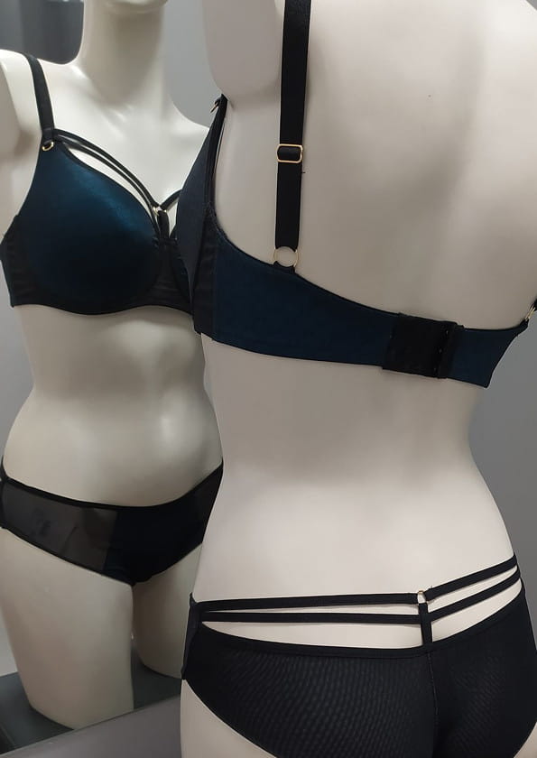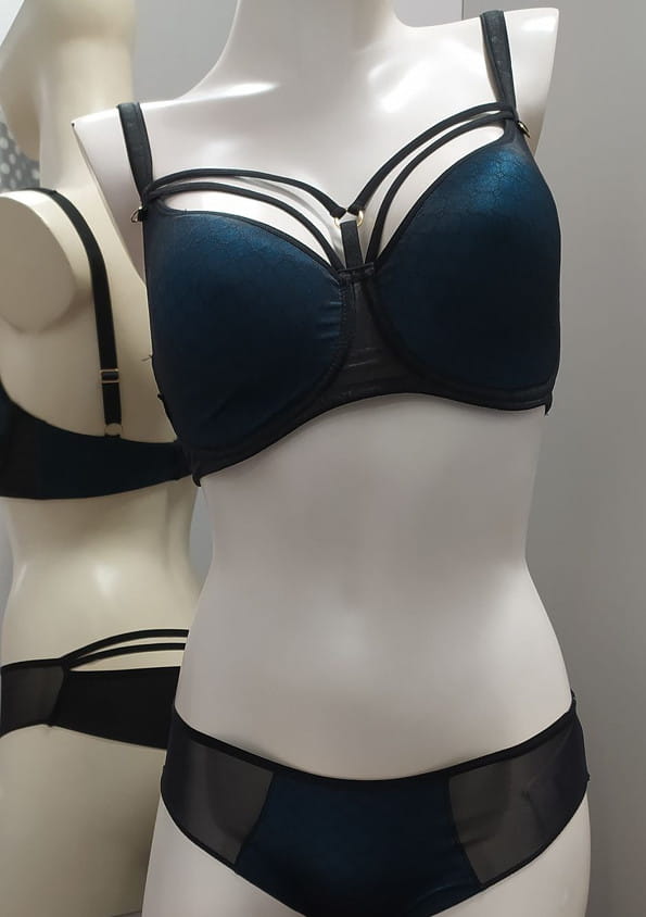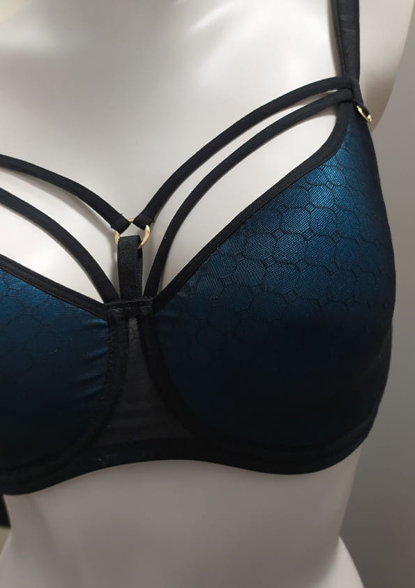 Oryginalny biustonosz z ozdobnymi paskami od firmy Lemax. Biustonosz z fiszbiną typu spacer z termicznie formowanymi miseczkami. Dzięki zastosowanej technologii pod wpływem ciepłoty ciała idealnie układa się do piersi. Miseczki wykonane z cienkiej, miękkiej pianki w odcieniu celestynowym, pokrytej z zewnątrz czarną siateczką o wzorze plastra miodu. Boki oraz tył wykonane z materiału o wzorze i kolorze jak miseczki biustonosza. Zewnętrzne obszycia biustonosza w kolorze czarnym. Ramiączka nie odpinane, czarne, gładkie, regulowane z tyłu. Dekolt ozdobiony elastycznymi, nie odpinanymi paseczkami, które pięknie ozdabiają biust. Ozdobne kółeczka przy ramiączkach oraz regulacja ramiączek z domieszką 24 karatowego złota, dzięki czemu nie odbarwiają się i nie tracą koloru. Tył zapinany na dwurzędowe haftki, z trójstopniową regulacją obwodu. Biustonosz pięknie prezentuje się przy odsłoniętym dekolcie. Model w odcieniu określanym przez firmę jako celestynowy - jak na zdjęciu.