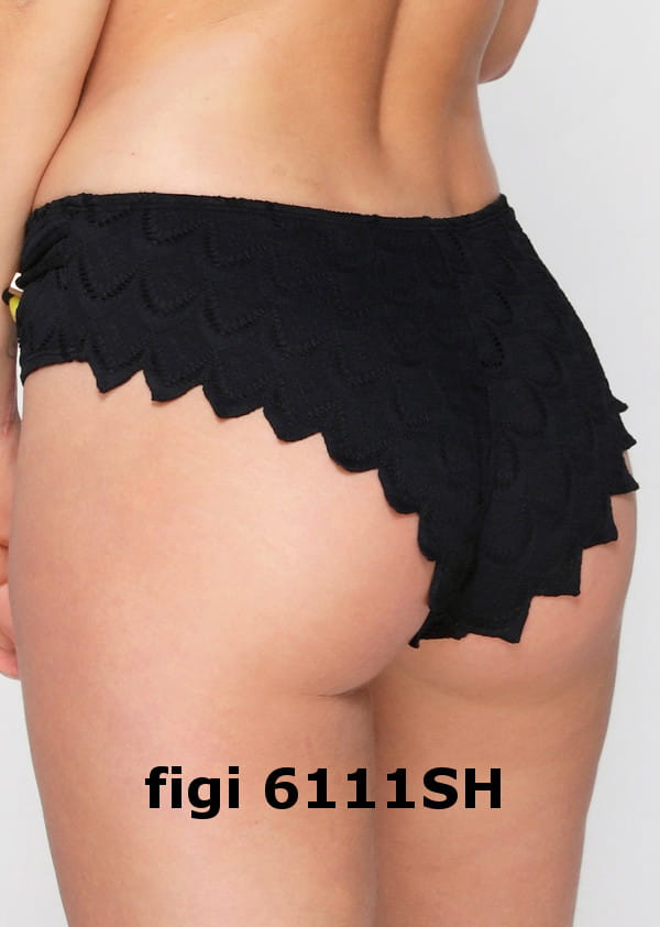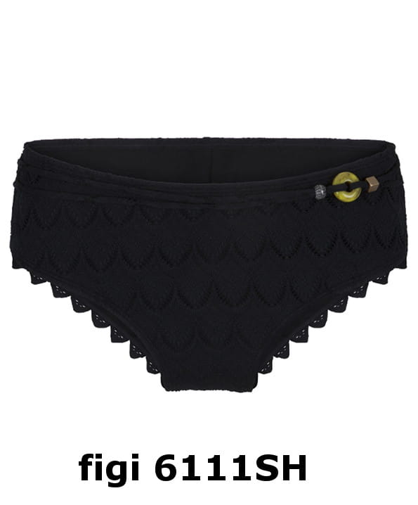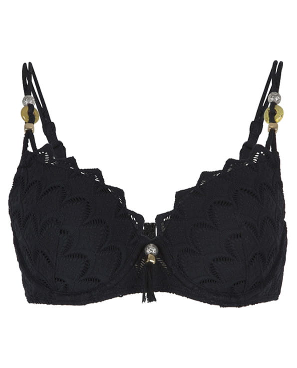 Dwuczęściowy kostium kąpielowy z ozdobną biżuterią i koralikami od zagranicznej firmy Lingadore. Kostium ładnie zbiera biust do środka, nadając mu okrągły kształt. Efektowne wykończenie nadaje uroku. Biustonosz z fiszbinami i usztywnianymi miseczkami, bez push-up. Miseczki pokryte elastycznym, ażurowym materiałem, górą ozdobna falbanka. Między miseczkami ozdobna biżuteria z frędzelkami. Ramiączka z tyłu od połowy regulowane, nie odpinane, przednia część wykonana z podwójnych sznureczków ozdobionych biżuterią oraz koralikiem. Obwód biustonosza we wzorze jak na miseczkach, wzmocniony od wewnątrz dodatkową warstwą materiału. Tył zapinany na plastikowy zatrzask. Figi 6111SH pełne, w znacznej części zakrywające pośladki, wzmocnione na całości od wewnątrz gładkim materiałem. Przód oraz tył nogawek wykończony gumką, na pośladkach ozdobna falbanka. Przód fig ozdobiony podwójnym sznureczkiem z biżuterią jak na ramiączkach. Model w kolorze czarnym-jak na zdjęciu.