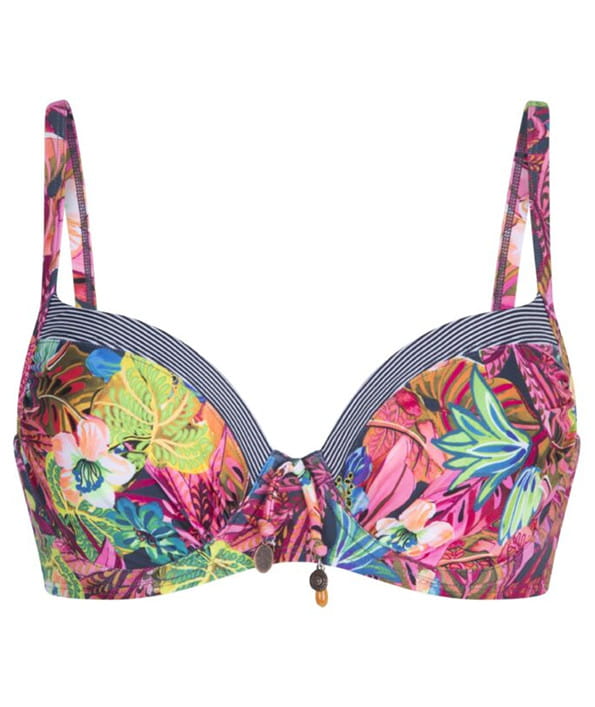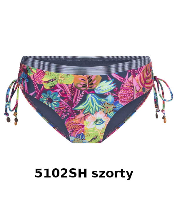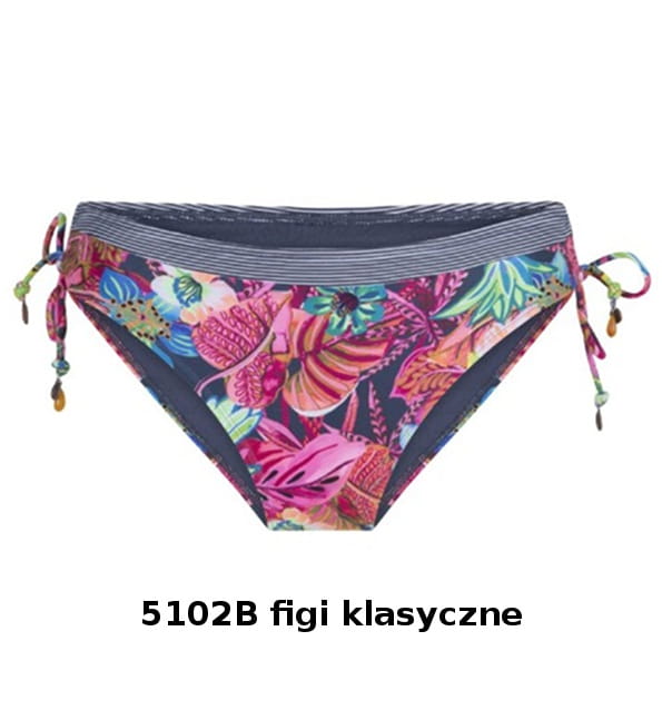 Dwuczęściowy kostium kąpielowy, który przyciąga uwagę dzięki pięknym, wyraźnym kolorom od firmy Lingadore. Biustonosz z usztywnianą, termicznie modelowaną miseczką zbiera biust do środka, nadając mu okrągły kształt. Ozdobiony kolorowym wzorem tropikalnych kwiatów, górna część w cieniutkie biało-czarne paseczki. Między miseczkami ozdobne sznureczki z biżuterią. Ramiączka nie odpinane, regulowane z tyłu. Tył zapinany na solidne, plastikowe zapięcie. Figi we wzorach jak biustonosz, w pasie paseczkowa wstawka. Po bokach ściągane sznureczkami, ozdobionymi na końcach również biżuterią. Figi dostępne w dwóch krojach: 5102B figi klasyczne, oraz 5102SH szorty (patrz galeria zdjęć). Figi od wewnątrz wzmocnione dodatkową warstwą materiału. Model o wzorze jak na zdjęciu. Przy zamówieniu prosimy o wybranie modelu i rozmiaru fig