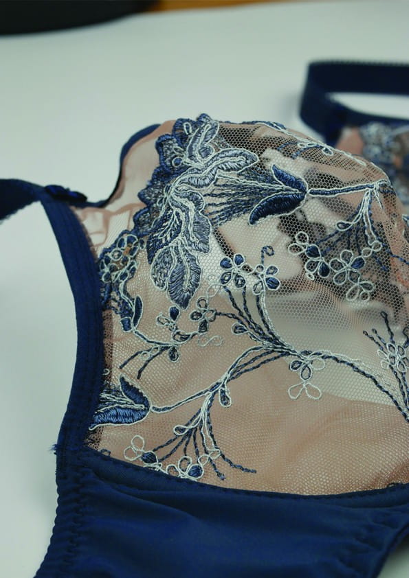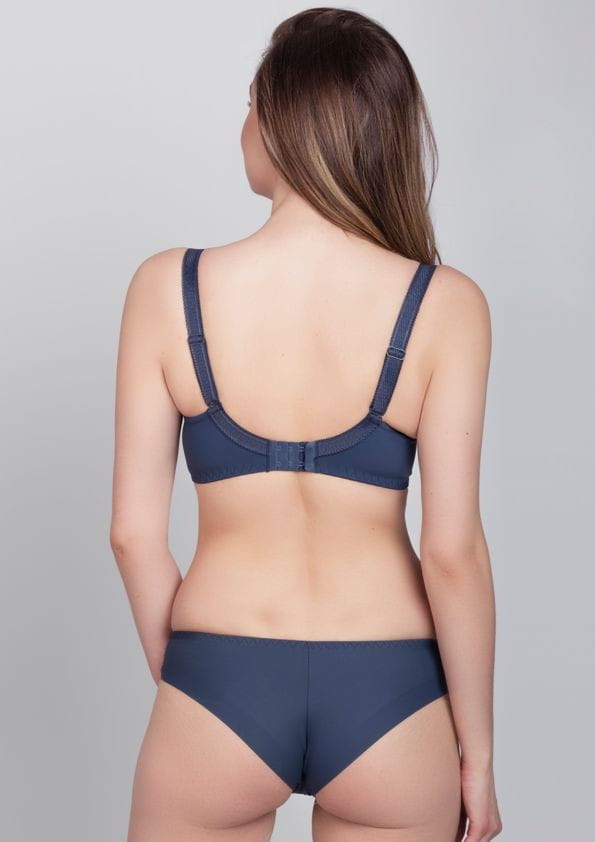 Model biustonosza typu „balconette” na fiszbinie, z miską wysoko zabudowaną, przeznaczony dla Pań z jędrnym biustem. Model unosi i zbiera biust do dekoltu, zapewniając mu jednocześnie stabilne podtrzymanie. 3/4 miseczki pokryte pięknym, kwiatowym haftem w odcieniach atramentowym, górna część przedłużona miękkim, elastycznym, beżowym tiulem, zakończonym atramentową gumeczką. Boki jak i tył wykonane z elastycznej dzianiny w jednolitym kolorze. Ramiączka gładkie, odpinane z tyłu, regulowane, przy miseczce ozdobione małą kokardką. Między miseczkami ozdobna kokardka. Do kompletu figi Adora B400 (klasyczne wyższe) oraz Adora M300 (tanga). Model jak na zdjęciu.