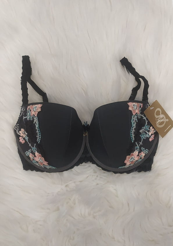Zmysłowy i uwodzicielski biustonosz z kolekcji Amor od firmy Samanta. Model z fiszbinami, usztywnianymi miseczkami. Przeznaczony dla Pań z większym i/lub mniej jędrnym biustem. Delikatnie powiększa, podnosi i zaokrągla biust, jednocześnie mocno go podtrzymując. Zbiera biust do dekoltu. Miseczki z dwoma, pionowymi cięciami, wykonane z elastycznej, grubszej pianki. Z zewnątrz pokryte po bokach tiulem z pięknym kwiatowym haftem w odcieniach różu i błękitu. Od środka wyściełane bawełną, która zapewnia komfort dla ciała. Dodatkowo kieszonki na wkładki push-up, które dołączone są do biustonosza (nie we wszystkich rozmiarach). Między miseczkami ozdobna kokardka z biżuterią. Ramiączka nie odpinane, ozdobione taśmą haftowaną, regulowane. Obwód wykonany z podwójnej siateczki, ozdobionej haftem. Całość wykończona gumą ozdobną. Tył zapinany na dwurzędowe haftki z trójstopniową regulacją obwodu. Model jak na zdjęciu, w kolorze określanym przez firmę jako grafit.