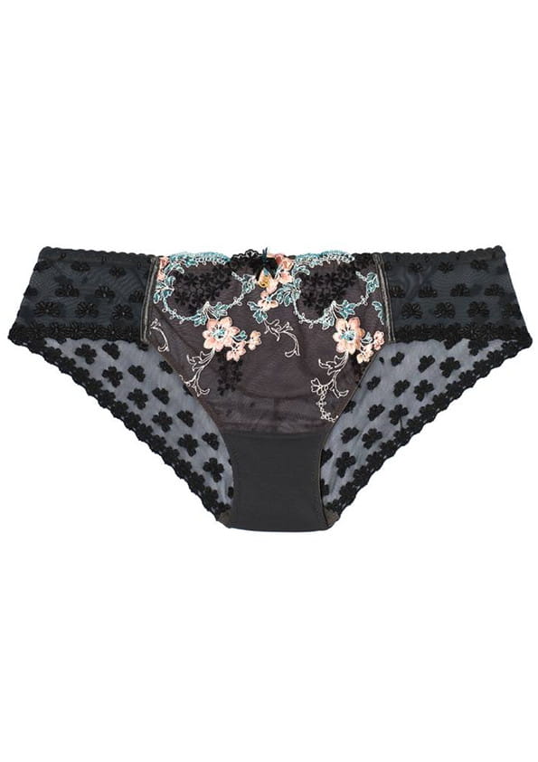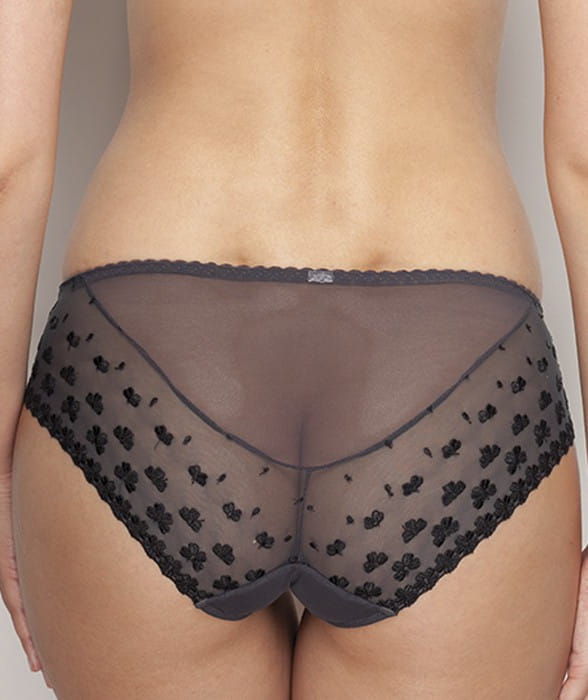 Eleganckie, zmysłowe figi klasyczne z kolekcji Amor od firmy Samanta. Figi o pełnym, klasycznym kroju, zakrywające pośladki, wysokość poniżej pępka. Dyskretnie zasłaniają boki. Nadają piękny kształt pośladkom. Idealne dla kobiet ceniących klasyczne kroje i komfort. Przód fig wykonany z tiulu ozdobionego kwiatowym haftem w odcieniach różu i błękitu. Boki oraz tył z miękkiej, elastycznej siateczki, z czarnym drobnym haftem na obrzeżach. Pas na środku ozdobiony kokardką z biżuterią. W kroku wszyta bawełniana wkładka dla większego użytkowania. Model jak na zdjęciu w odcieniu grafitowym.