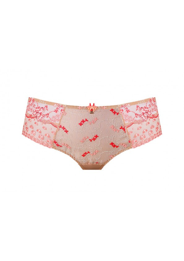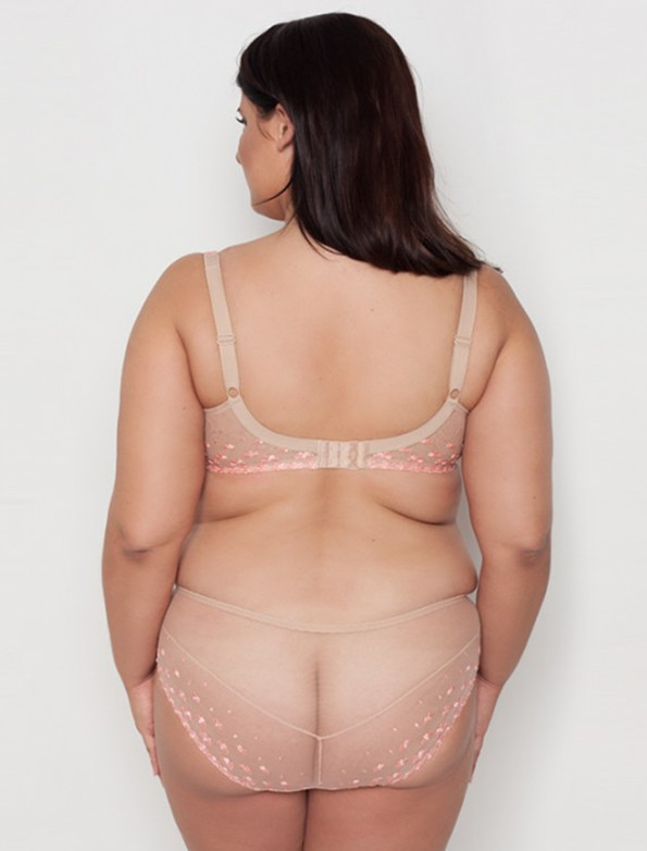 Eleganckie, z pięknym neonowym haftem figi typu maxi z kolekcji Amor od firmy Samanta. Figi z wysokim stanem do wysokości pępka. Zakrywające boki oraz pośladki. Boki oraz krok o większej szerokości zapewniają więcej dyskrecji. Idealne dla Pań które chcą dyskretnie modelować swoją sylwetkę. Przód wykonany z podwójnego, beżowego tiulu ozdobionego kwiatowym haftem w odcieniach różu i kremu. W pasie na środku ozdobna kokardka z biżuterią. Tył wykonany z miękkiej, elastycznej, beżowej siateczki ozdobionej na obrzeżach różowym haftem. W kroku wszyta bawełniana wkładka dla większego komfortu użytkowania. Model jak na zdjęciu.