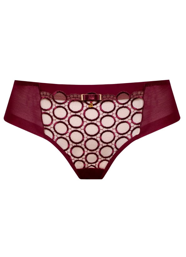 Tanga zwana często „brazylian”, o klasycznej wysokości poniżej pępka. Zasłania i eksponuje w 1/2 kobiece pośladki. Idealne pod odzież przylegającą mocno do ciała. Przód ozdobiony szwajcarskim haftem o wzorze geometrycznym. Tył gładki z bezszwowym wykończeniem dzięki czemu nie roluje się i nie wybija się pod ubraniem. Nogawki z przodu i pas wykończone gumą ozdobną. Na przodzie ozdobione biżuterią z ręcznie robioną kokardką. Tył ozdobiony łezką ze złotym kołeczkiem. Wewnętrzna część kroczka wykonana ze 100% bawełny. Model jak na zdjęciu w odcieniu rubinowym. Do kompletu biustonosz Boobie A143.
