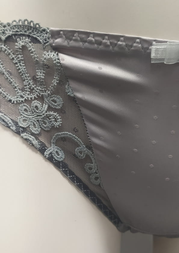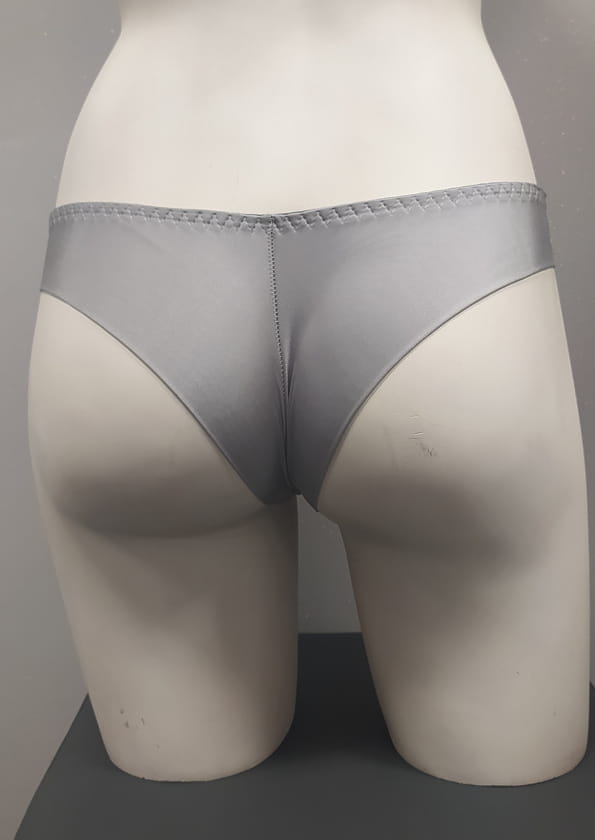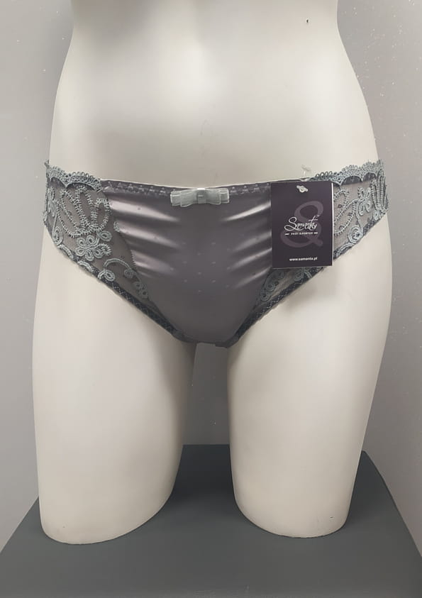 Figi typu tanga zwane też brazyliany od polskiej firmy Samanta. Wykonane z elastycznej i przyjemnej dla ciała dzianiny. Przednia część fig ozdobiona drobnymi kropeczkami. Boki z tiulu ozdobionego haftem. Bok średniej szerokości 3-5cm. Tył gładki, wykończony bezszwowo dzięki czemu nie odznacza się pod obcisłym ubraniem. Zasłania a jednocześnie odkrywa 1/2 pośladków ładnie je eksponując. W pasie wszyta gumka, dodatkowo na przodzie ozdobna, posrebrzana kokardka. W kroku wszyta od wewnątrz bawełniana wkładka dla większego komfortu użytkowania. Model dostępny w odcieniu popielatym-jak na zdjęciu.