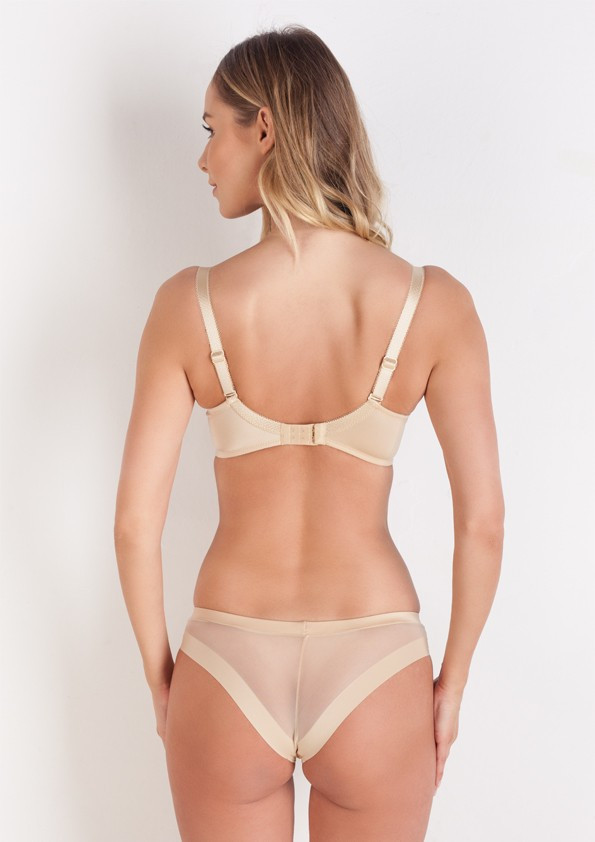 Model podnoszący i ładnie zbierający biust do dekoltu. Miseczki usztywniane pianką, podszyte od wewnątrz bawełną, z kieszonkami na wkładki dołączonymi do biustonosza. Z zewnątrz miseczki pokryte stabilnym haftem z dodatkiem złotej nici. Ramiączka ozdobne, odpinane i regulowane z tyłu. Model jest przeznaczony dla Pań z mniej jędrnym biustem. Jest idealny dla kobiet po okresie karmienia. Całość wykończona gładką gumą obszywkową.