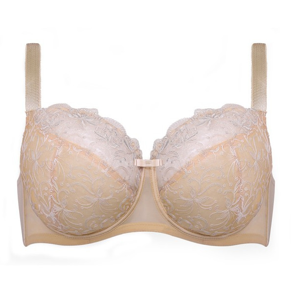 Biustonosz zbiera, zaokrągla i naturalnie eksponuje biust. Głębokie miseczki zakrywające biust wykonane z haftu, przeplatanego złotą nitką o wzorze kwiatowym. Szwy od wewnątrz lamowane dzięki czemu nie powodują podrażnień. Środek wykonany ze stabilnej siatki, tył z miękkiej dzianiny. Ramiączka ozdobione cienką tasiemką, regulowane, nie odpinane, podszyte od wewnątrz pianką z bawełną, dzięki czemu nie powodują otarć ani podrażnień zapewniając tym samym większy komfort użytkowania. Całość wykończona gładką gumą obszywkową .