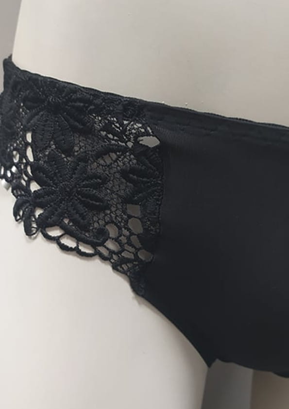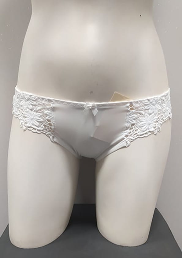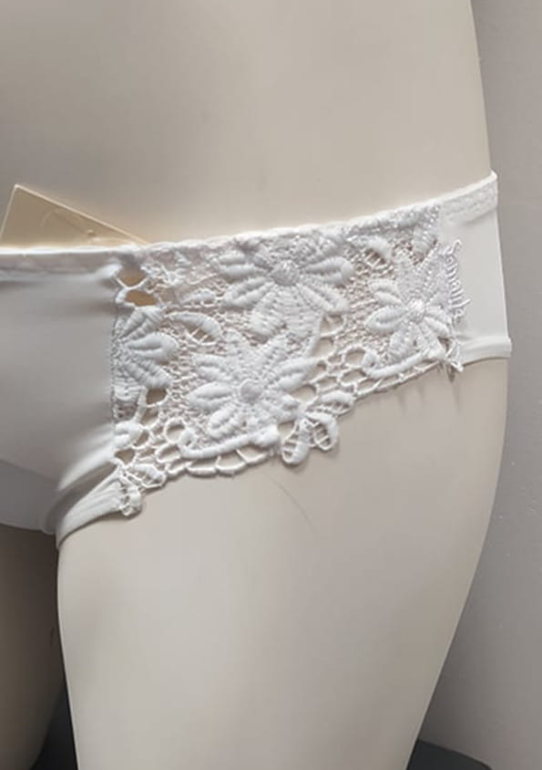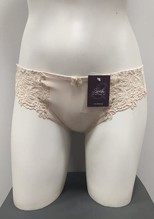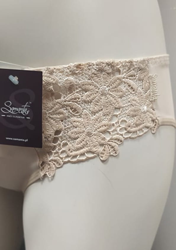 Figi o klasycznym kroju z elegancką gipiurą od firmy Samanta. Figi wykonane z elastycznej, gładkiej dzianiny, boki z ażurowej gipiury z motywem kwiatowym. Kwiatowy wzór sprawia, że bielizna jest delikatna i elegancka. Figi dyskretnie zasłaniają boki oraz pośladki, wysokość poniżej pępka. Tył gładki wykonany z miękkiej dzianiny. Nogawki oraz pas wykończone delikatną gumeczką. W klinie od wewnątrz wszyta bawełniana wkładka dla większego komfortu użytkowania. W pasie delikatna kokardka z perełkami. Figi idealne dla kobiet ceniących klasyczne kroje i komfort. Model jak na zdjęciu dostępny w kolorze białym, beżowym i czarnym.
