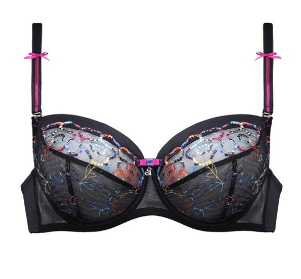 Piękny biustonosz miękki z fiszbinami od polskiej firmy Samanta. Model biustonosza przeznaczony dla Pań ze średnim biustem. Krój biustonosza zbiera i podnosi biust, zapewniając mocne podtrzymanie i duży komfort użytkowania. Miseczki wykonane z cienkiego, czarnego tiulu, pokryte kolorowym haftem o wzorze liści. Kolorowy haft pięknie komponuje się na czarnym tle. Ramiączka ozdobne, regulowane, odpinane. Do kompletu figi B400 i M300.
