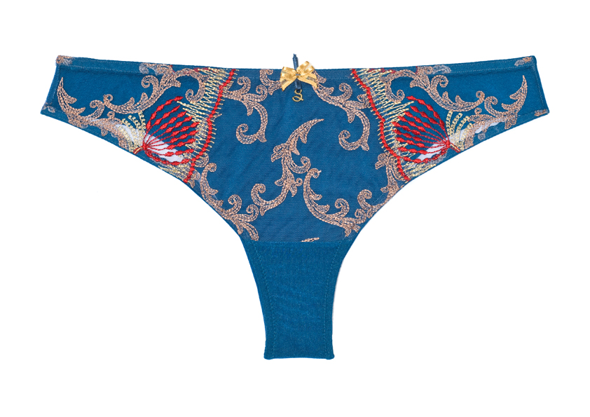Figi typu tanga, inaczej zwane brazyliany z kolekcji Hypnose od polskiej firmy Samanta. Wysokości fig poniżej pępka. Zasłaniają i jednocześnie eksponują 1/2 pośladków. Przód wykonany z podwójnego tiulu ozdobionego stabilnym, ornamentowym haftem w odcieniach złota i czerwieni. W górnej części fig ozdobna złota kokardka z biżuterią. Tył wykonany z podwójnej, elastycznej, miękkiej siateczki wykończonej bezszwowo, dzięki czemu nie odznacza się pod obcisłym ubraniem. W kroku od wewnątrz wszyta bawełniana wkładka dla większego komfortu użytkowania. Model w kolorze indygo-jak na zdjęciu. Do kompletu biustonosz Hypnose A333.