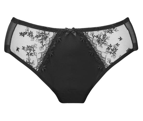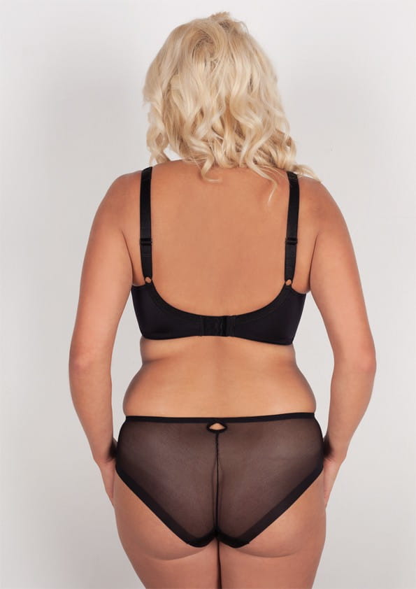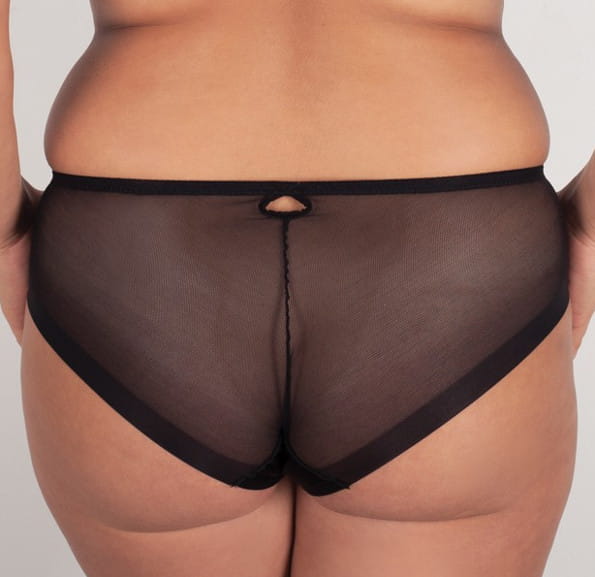 Urocze majteczki typu midi, wysokość poniżej pępka. Przód uszyto z haftu i dzianiny, natomiast tył z dzianiny clean cut ,gładki wykończony bezszwowo.Pas i nogawka z przodu podszyte gładką gumką. Przód zdobi delikatna kokardka. Model dostępny w kolorze czarnym.