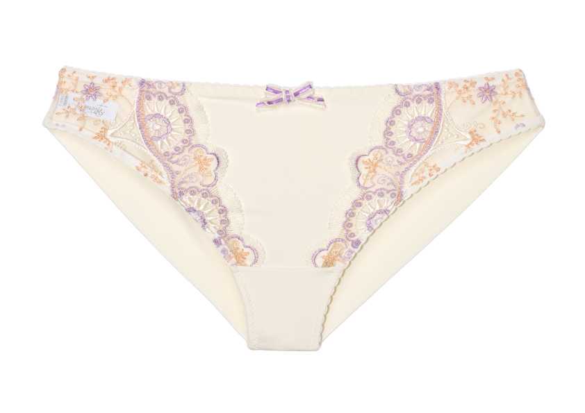 Figi Mintaka B300 to bielizna dla Pań ceniących komfort i wygodę. Figi klasyczne wykonane z przyjemnej dla ciała dzianiny. Przód wykończony delikatną gumeczką, boki ozdobione tiulem z fioletowo-złotym haftem. Na środku delikatna kokardka. Tył zakrywający pośladki, wykonany bezszwowo dzięki czemu nie odznacza się pod obcisłym ubraniem. Klin podszyty dodatkowo bawełną. Model w kolorze jak na zdjęciu-kremowym. Do kompletu biustonosz Mintaka A330 i Mintaka A333.