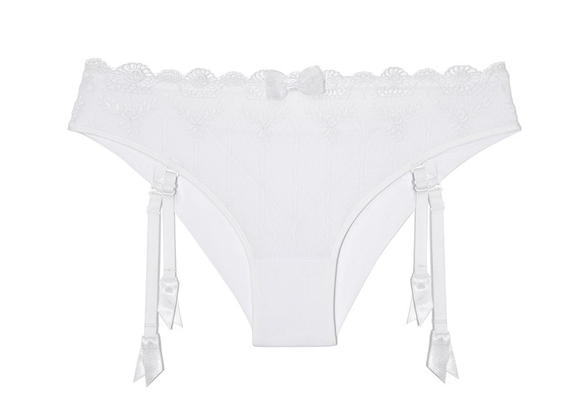 Tanga zwana często „brazylian”, o klasycznej wysokości poniżej pępka. Zasłania i eksponuje w 1/2 kobiece pośladki. Przód to bogate połączenie dzianiny, delikatnej dzianiny i haftu. Tył wykonany z delikatnej dzianiny. Dzianina stanowi bezszwowe wykończenie tyłu, dzięki czemu tanga nie wybija się pod ubraniem. Posiadają odpinane, regulowane paski do pończoch. Pas oraz przód nogawek wykończone gumą ozdobną.Tanga ozdobiona z przodu kokardką.