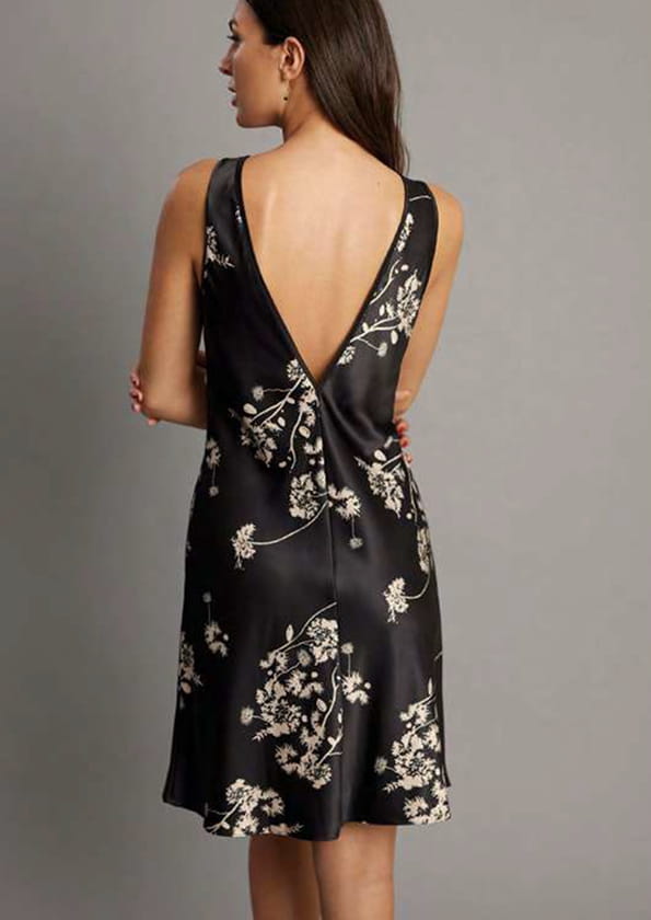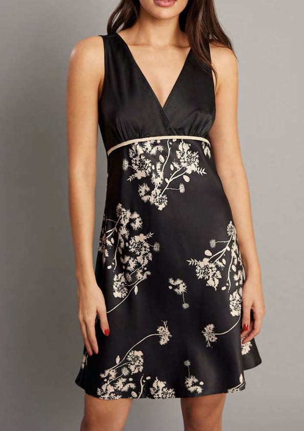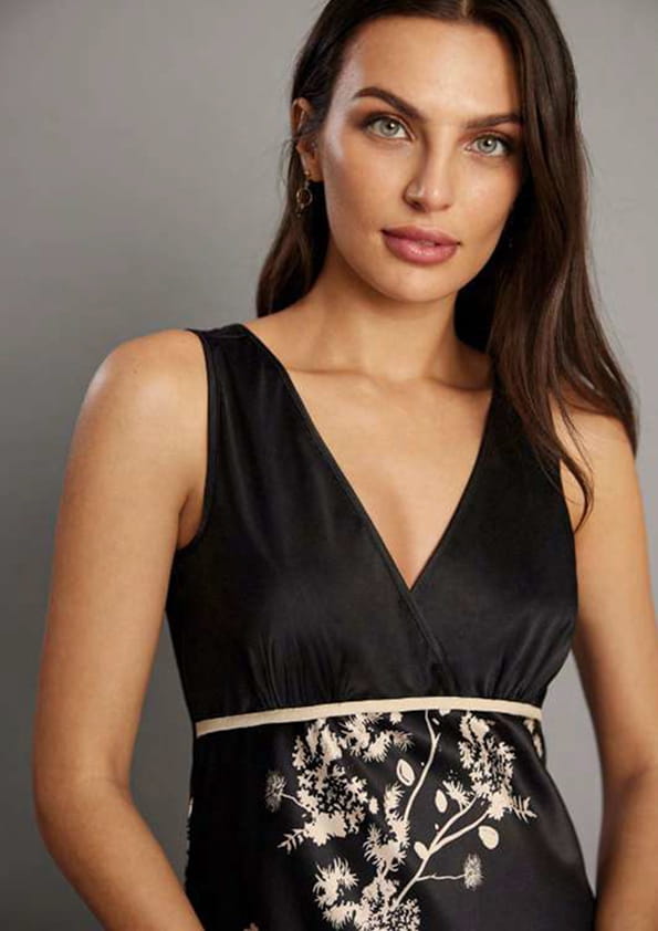 Elegancka, satynowa koszulka nocna od hiszpańskiej firmy Selmark. Przyjemny dla ciała, mięsisty a za razem nadający lekkości materiał zapewnia wysoki komfort użytkowania. Koszulka na szerszych, nie regulowanych ramiączkach. Dekolt kopertowy, pod biustem odcięcie. Tył koszulki z głębszym wycięciem w literę V. Krój w delikatny trapez. Koszulka w kolorze czarnym, ozdobiona roślinnym wzorem w odcieniu jasnego beżu. Do kompletu szlafrok P5071. Model jak na zdjęciu.