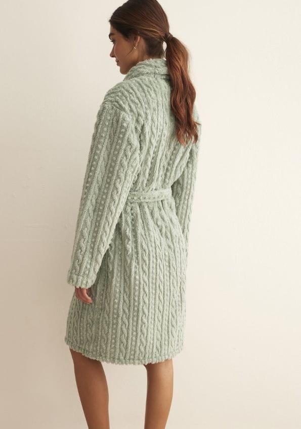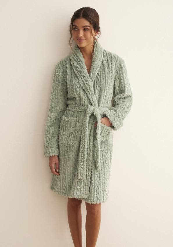 Super miękki szlafrok z polaru. Szalowy kołnierz, wiązany w pasie i dwie duże kieszenie naszyte z przodu szlafroka. Długość do kolan.