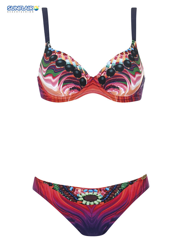 Dwuczęściowy kostium kąpielowy z serii Fire Bird od niemieckiej firmy Sunflair. Biustonosz z fiszbinami i usztywnioną miseczką. Model zakrywa biust jednocześnie pięknie go eksponując. Ramiączka regulowane, odpinane z tyłu dzięki czemu można je skrzyżować na plecach lub zawiązać na szyi. Miseczki ozdobione wzorem biżuterii o ognistych barwach. Figi o klasycznym kroju, zasłaniające pośladki. Przód fig w kolorystyce nawiązującej do biustonosza, tył w kolorze ciemnego fioletu. Żywe kolory oraz piękny wzór dodają elegancki i podkreślają opaleniznę. Model jak na zdjęciu.