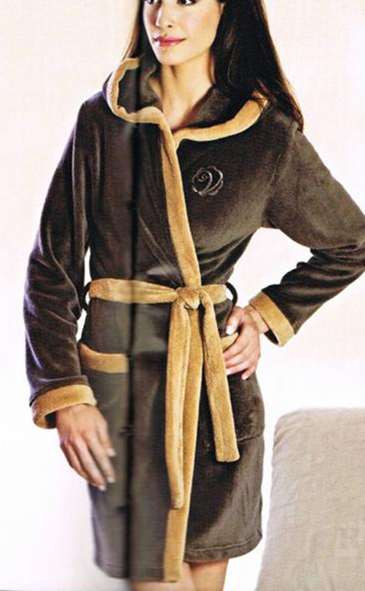 Cieplutki, miły w dotyku szlafrok wykonany z materiału o składzie: 100% poliamid. Krótki o długości 90cm (mierzony od ramienia w dół). Model z kapturem i naszytymi kieszeniami, wiązany za pomocą paska. Dostępny w kolorze brązowym. Lewą, górną część zdobi delikatna, haftowana różyczka.
