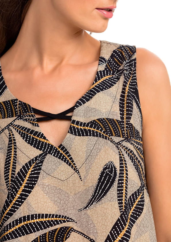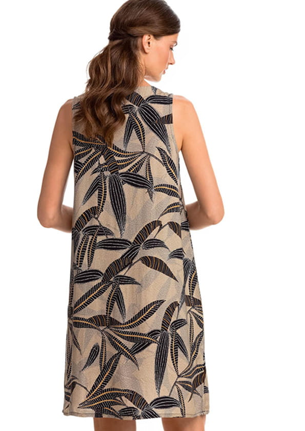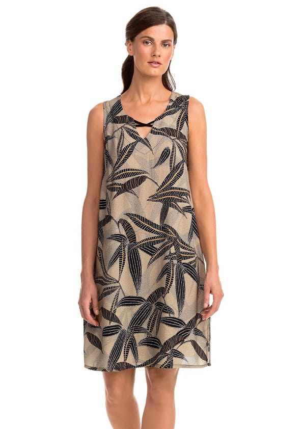 Vamp 14412 Stylowa i elegancka sukienka na co dzień i na plażę. Wykonana jest z wysoko gatunkowej popeliny wiskozowej, która jest mocna, wytrzymała, a jednocześnie miękka i przyjemna w dotyku. Dzięki wiskozie jest dla ciała chłodna i idealna na ciepłe lato. Sukienka na szerszych ramiączkach, dekolt w literę V ozdobiony skrzyżowanymi, czarnymi paskami. Dołem po bokach delikatne rozcięcia.Dostępna w odcieniu beżowo-szarym, ozdobiona czarnym motywem roślinnym.