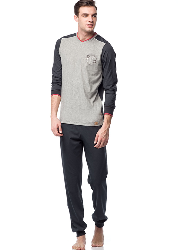 Męska piżama z długim rękawem od firmy Vamp. Koszulka z długim rękawem, zakończonym ściągaczem. Dekolt w serek wykończony czerwoną lamówką, na klatce piersiowej delikatny nadruk. Rękaw i tył koszulki w kolorze grafitowym, przód w odcieniu szarym. Spodnie z długą nogawką, gładkie, grafitowe, dołem zakończone ściągaczem. W pasie wszyta gumka. Model jak na zdjęciu.